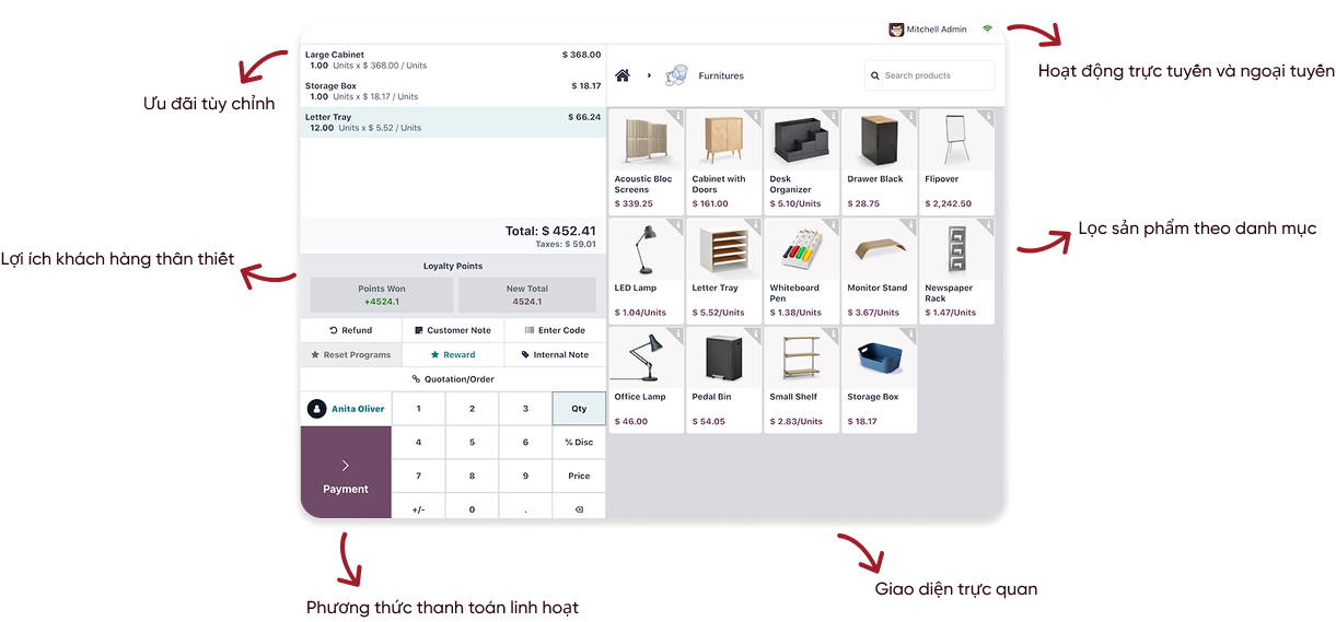 Odoo POS cung cấp giao diện nhanh, trực quan và dễ sử dụng, hỗ trợ cả chế độ online và offline. Hệ thống tăng tốc độ xử lý giao dịch, giảm thời gian chờ của khách hàng, đồng thời giúp nhân viên dễ dàng tìm kiếm sản phẩm, áp dụng chiết khấu và tích hợp chương trình khách hàng thân thiết, từ đó nâng cao trải nghiệm mua sắm tổng thể.